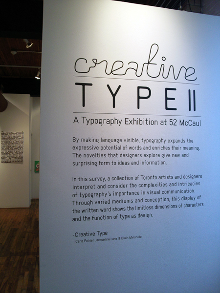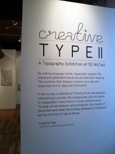 Over the weekend, I went to check out the Creative Type II Exhibit at Gallery 52 McCaul. Small exhibit but some very good pieces and some… interesting ones. Either way, definitely got my creative juices going… I wanna do some type explorations projects but I blame the lack of time and the fact I’m design exhausted from work.