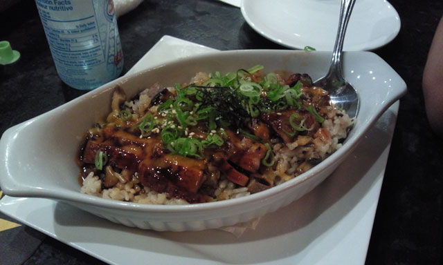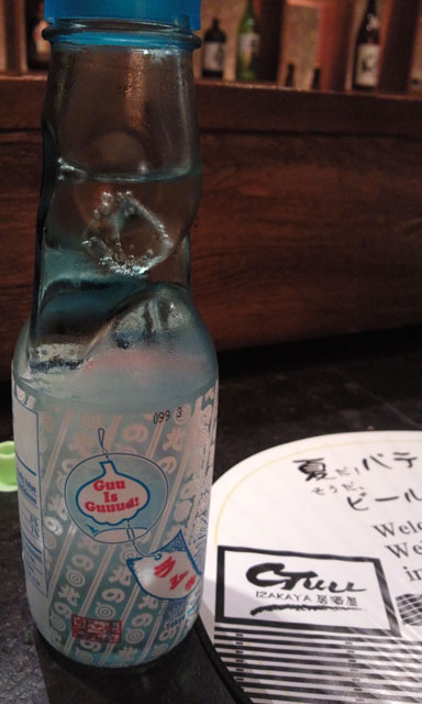 As soon as you enter through the doors, all the kitchen, servers and bartenders loudly greet you in Japanese. You’re seated, presented warm towel and with a menu of Japanese dishes; no sushi or rolls but authentic mini-platters like takoyaki, onoyamaki , beef ribs, enamame, and more. Chris and I ordered eel on rice, w/ mushroom, takoyaki, beef ribs, scallops and grilled saba accompanied by the Ramune (the Guu marble soda drink)