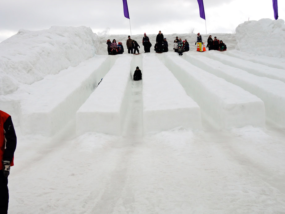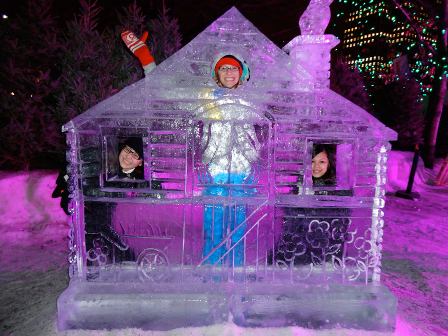 Our plan today was to hit up the Ottawa Winterlude festival and go skating on Rideau Canal. After our hearty homemade bacon and eggs breakfast, we headed to Jacques Cartier Park in Gatineau, Quebec to the Snowflake Kingdom to try winter activities. We slid on the ice slides, tubed down a mini hill, snow skated and saw snow sculptures. It was a bit melted due to the warm weather but that didn’t damper our spirits.