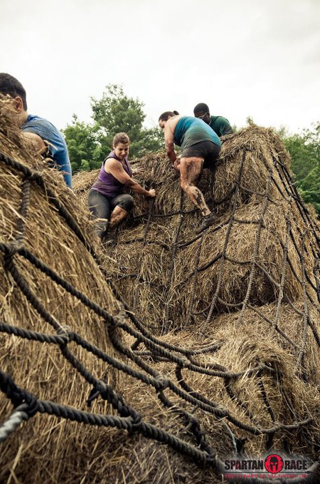 Climbing a large hay stack with rope ladder. Not too tough but I was pretty exhausted of climbing now.