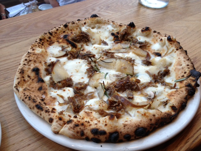 Get the Duck Confit pizza from Pizzera Libretto. Each pizza place serve authentic wood oven thin crust pizza which is remarkable. Everything tastes so well together and you are even excited to eat the crust.