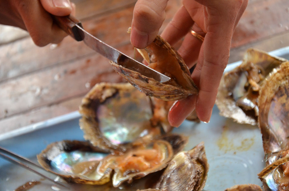 We ate breakfast and then boarded a smaller boat to transfer onto a larger “day boat”. This day boat was actually very cozy and nice. We got to see more of the bay, but it did start to all look the same after a while. Our first stop was a Pearl farm, where we got to see how pearls were cultivated. I never knew that actually existed… They put two oysters pearls in a clam, with some food (which is another piece of dead oyster) and then let it sit in the sea for 3-5 years. The success rate is only 30%.