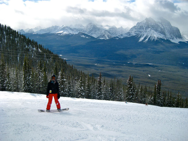 We were up early for another day on the mountains. This time we went to Lake Louise, the mountain with the highest vertical drop in Alberta. The skies were clearer and the sun was peaking through the clouds. The view was fantastic and just what I pictured snowboarding down the Rockies. The snow conditions were not as good as Sunshine but still better than Ontario or Vermont. Since it was a weekday, the runs were pretty empty and there were minimal lift lines.