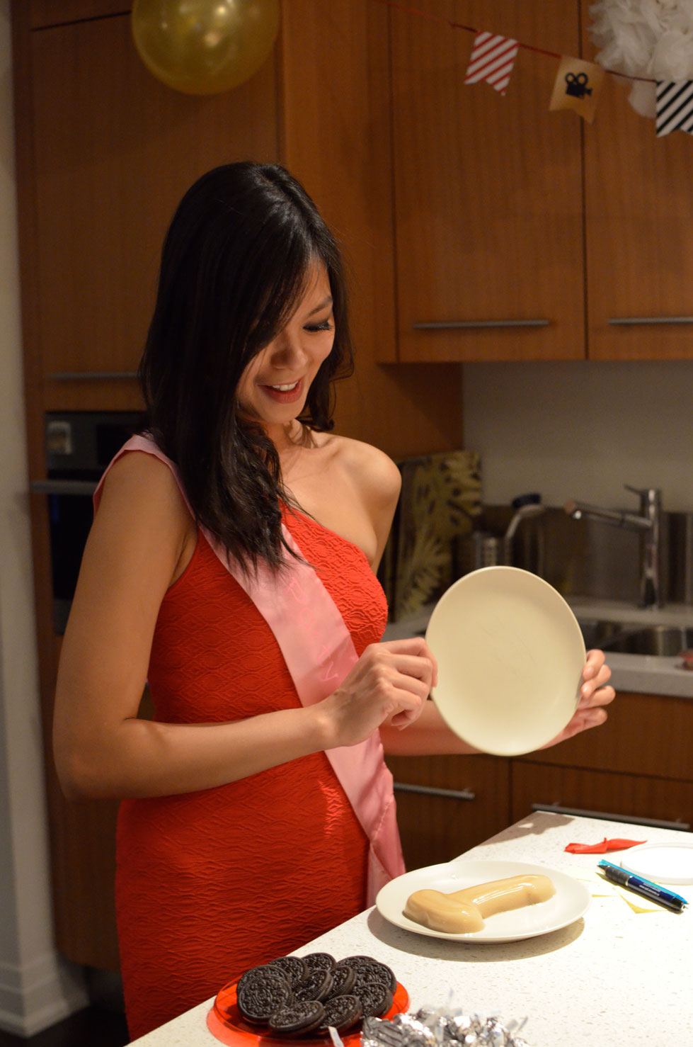 Then, Linda was shocked to find out I recorded Mike and got him to answer a bunch of questions. Each time she got one wrong, she would have to pick a truth or date from the cup or// perform the “mystery dare”. The questions were fairly simple like where did you first meet? Who is the better dancer? But she got most of them wrong!!! Even the 50/50 ones where the answer is either Linda or Mike. Works out for us! We enjoyed the entertainment as she answered the truths and performed the dares. My favourites included her Miss America speech, lap dance on Linh, #selfie Facebook photo, dirty talk and 15 seconds reenactment on Mike (HAHAHAH! That one was hilarious). However, none of them compared to the giggles of the “mystery dare” which involved eating a penis-shaped jello with no hands. Sandra did an amazing job with the coffee and coconut milk mixture to get it to a light skin tone.