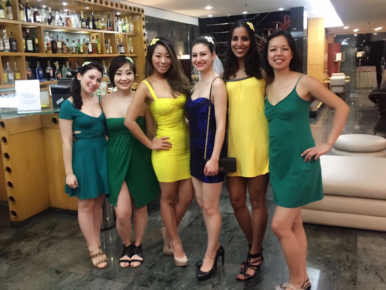 We went back to our hotel to get ready for Saba’s bacholerette night. We wore our designated Brazilian flag colors and I had a makeshift dress from Tania’s long sleeve shirt. I got it to work quite well though. We headed out to a hotel bar called Baretto Londres where we quizzed the bride on her fiancé. Wrong answers results in taking a drink and right answers means the other girls drink. The night started out tame before our bartender gave us free shots.