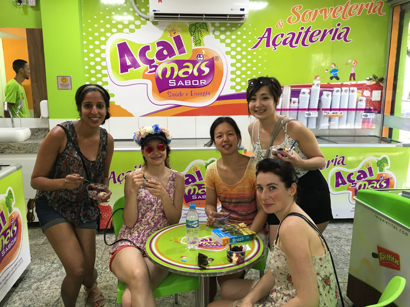 Unfortunately all the shops were closed after the carnival parade but regardless we explored the high-end Ipanama shopping area in the heat. Along the way, we stopped for some snacks which included an Acai berry ice cream shop and a tapioca crepe place. The acai berry ice cream was okay but I preferred some of the unique ice cream flavors such as corn! The tapioca crepe was crispier than I expected but it was different… though not that memorable. We stopped at a french bakery where Michelle wanted to order a decaf coffee… The staff had no idea what a “decaf” was and Sofia confidently advised Michelle it’s a “decaf-inato”. Michelle restated that to the staff and they understood. Soon after, Sofia admits she just made it up. It became a inside joke as the trip went on.