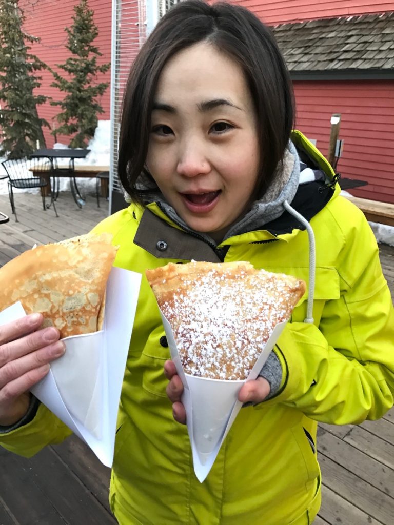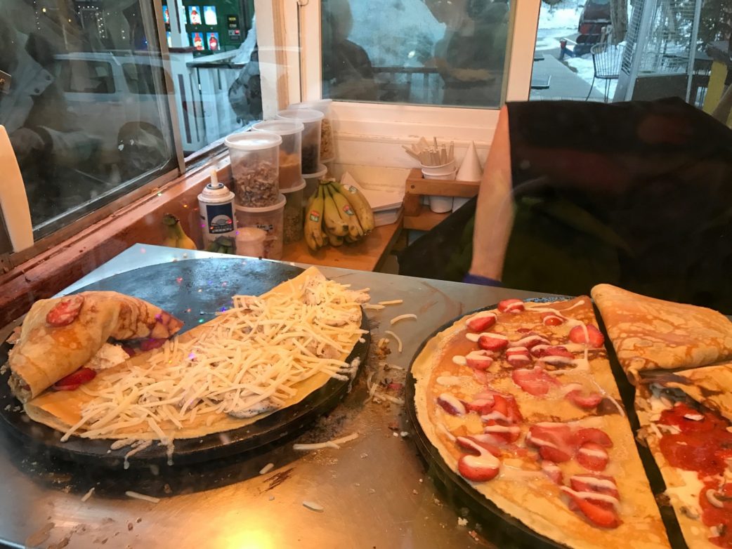 After lunch at a lodge, we did a few more runs on Peak 7 and Chi and I finished up in a fun kids area, a narrow winding run lined with trees on either side. It was fun and quite challenging actually. Chi dropped his gloves at the shuttle stop, so we drove back to find them… And since we were already out, we decided to go wait in line at the popular crepes spot, A La Crepes. The crepes were decent but I’d much rather have some Beaver Tails.