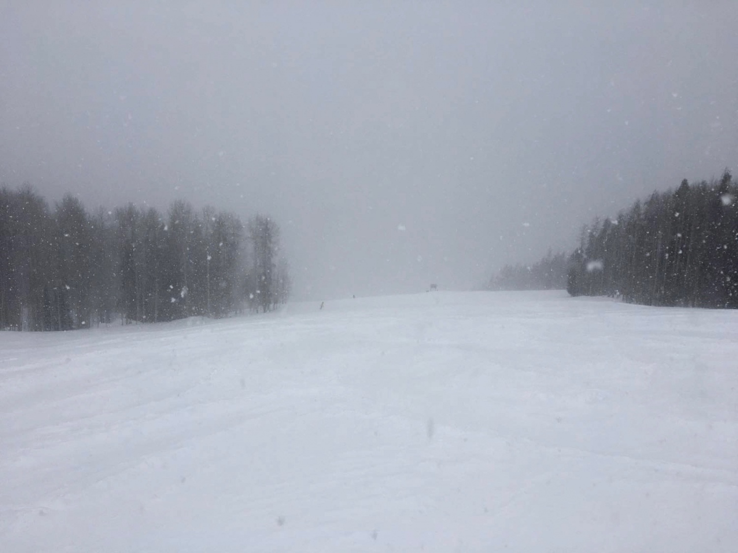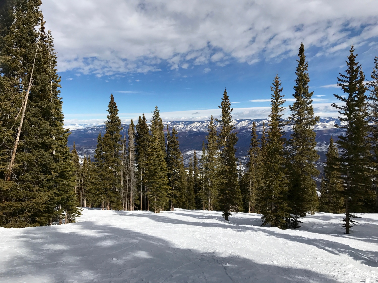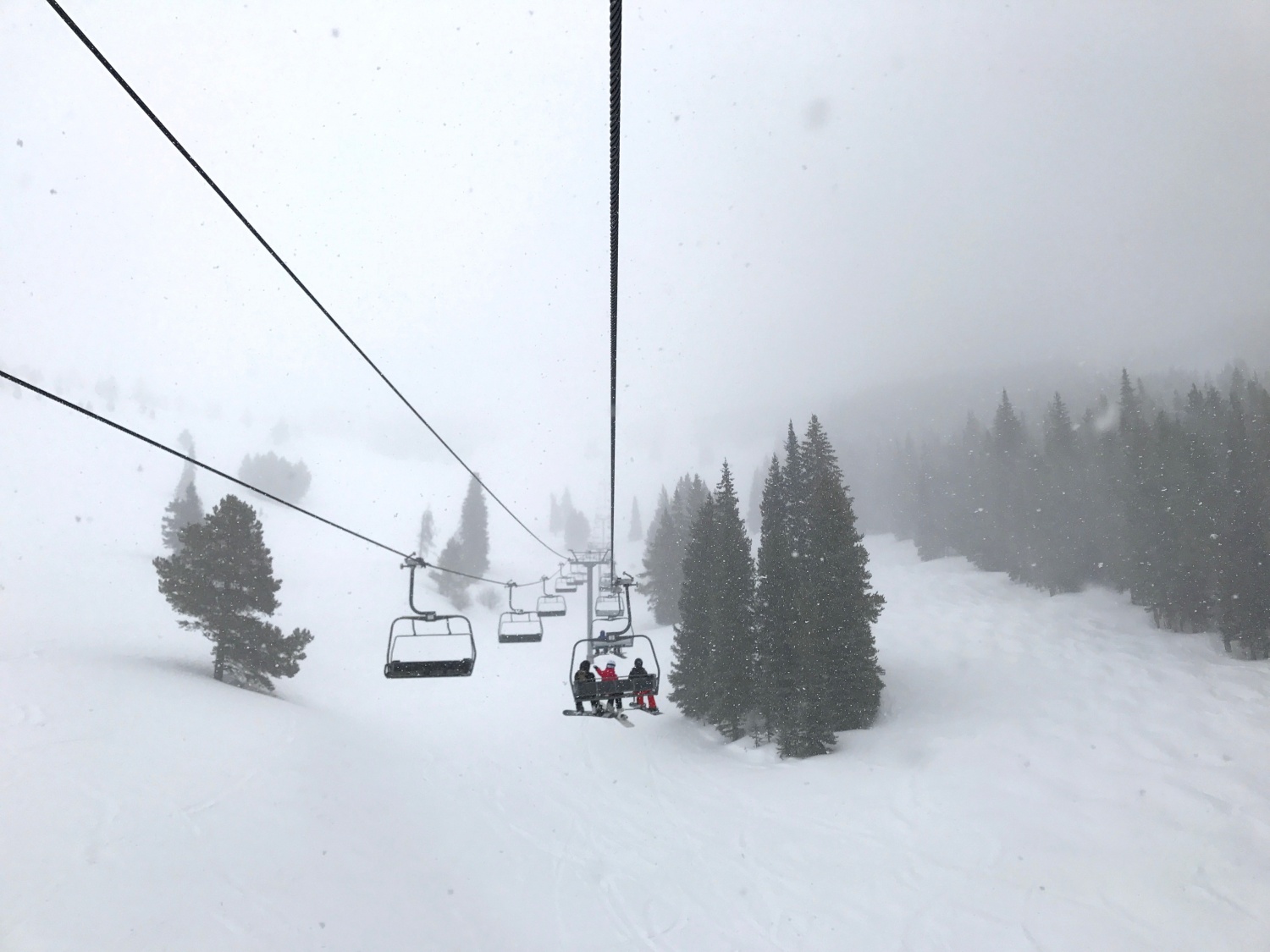 This was our first day at Vail and it was grey and snowy out. We bundled up and boarded the front side of Vail, starting with Simba Trail and working our way east to Flapjack. The runs were long, visibility was low but the snow was fresh.