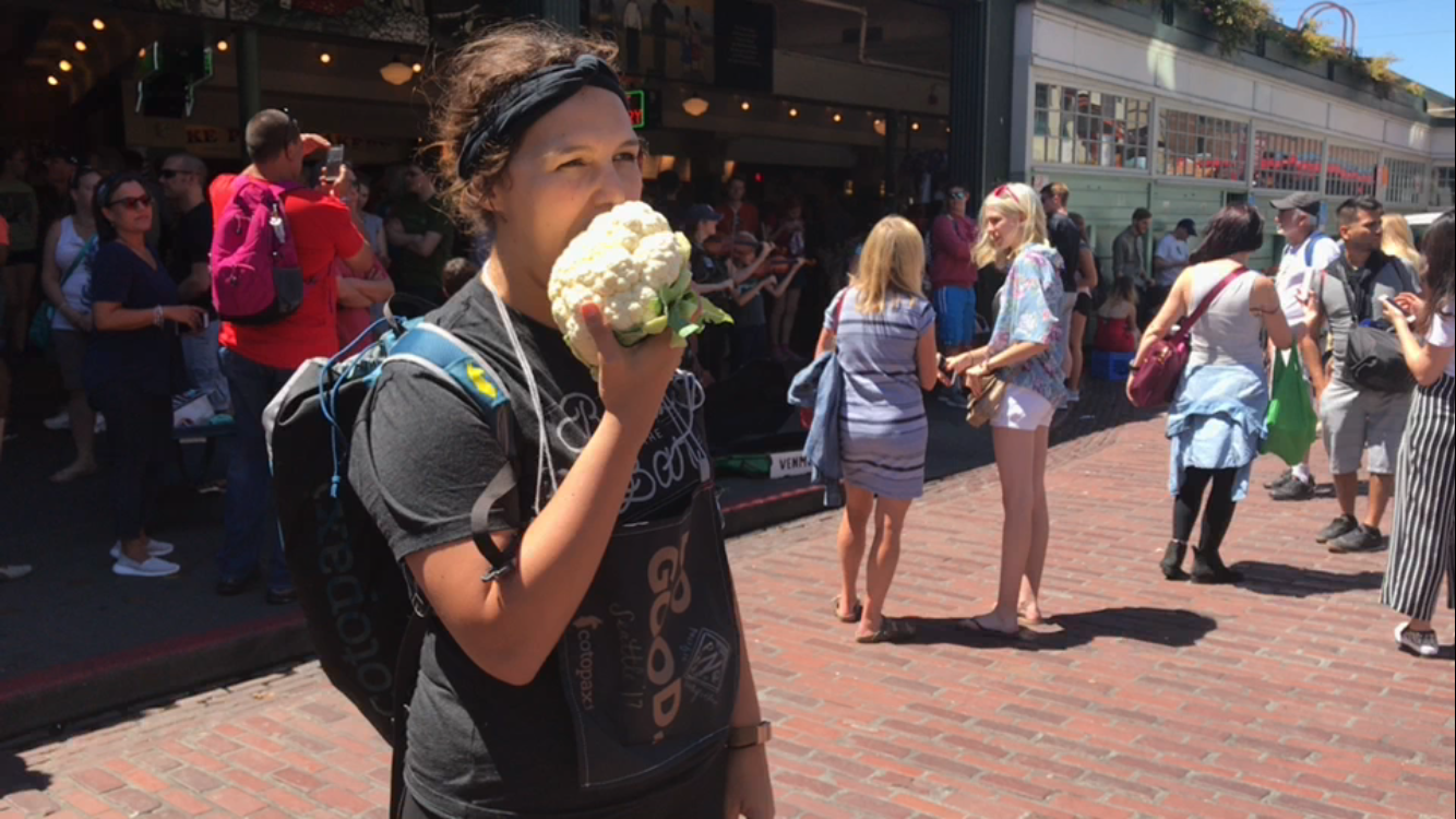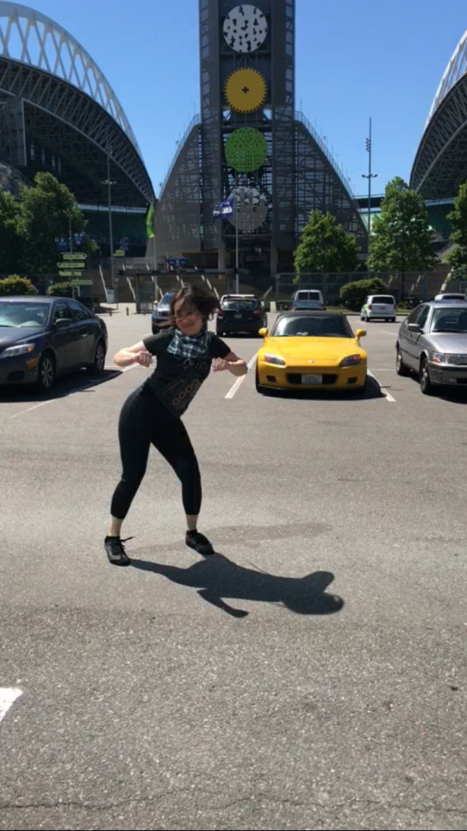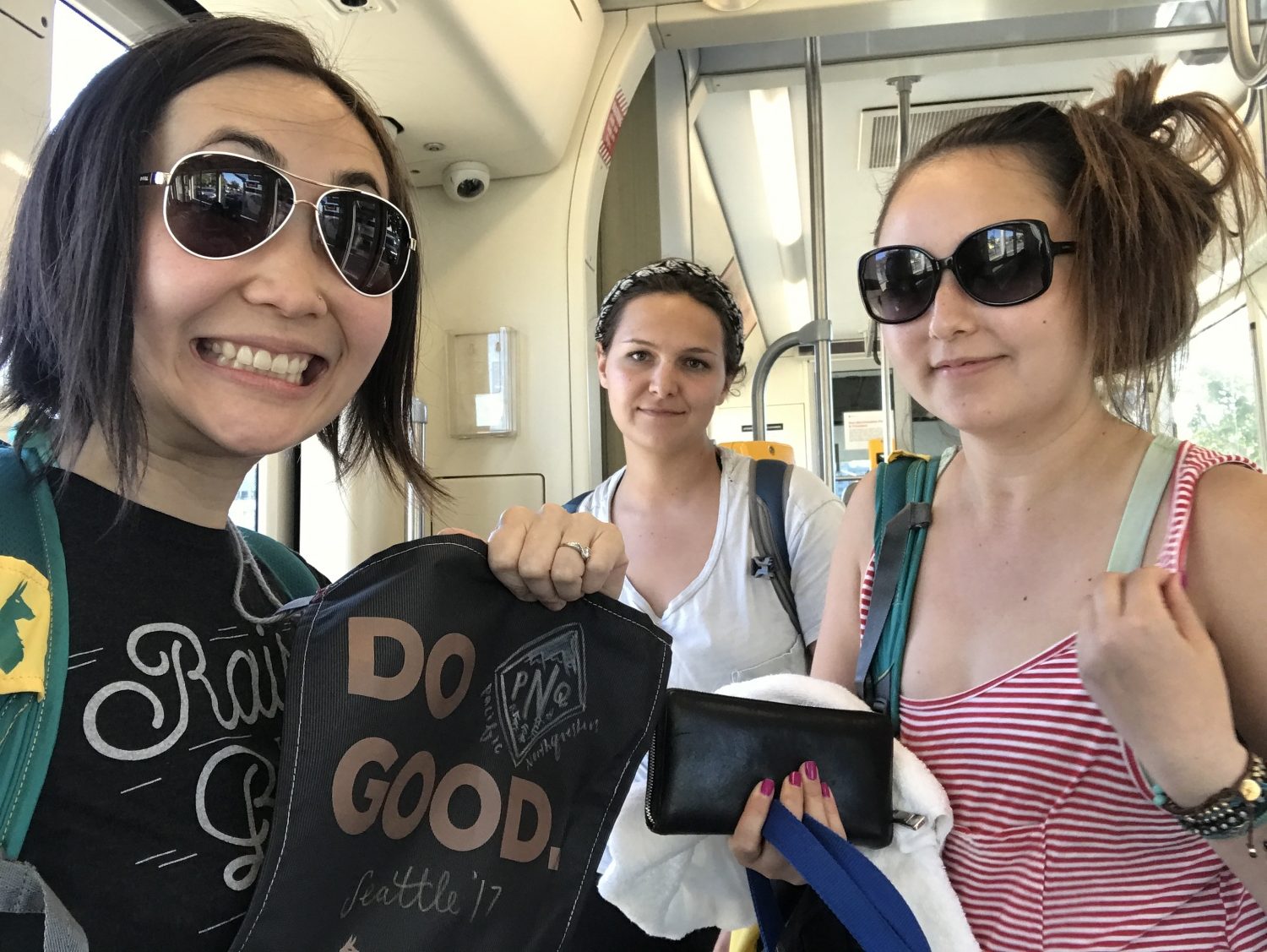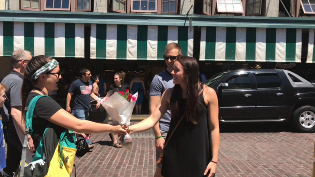 We made a Goodwill donation, did a touchdown celebratory dance in front of the Century Link field and had lunch at a Turkish restaurant. We took photos in front of the SAM and square danced in front of Pike Place Market. I also get extra closed to the Gum wall and Emily and Claire gave away flowers. Emily also ate cauliflower like an apple there but no one gave her an odd stare.