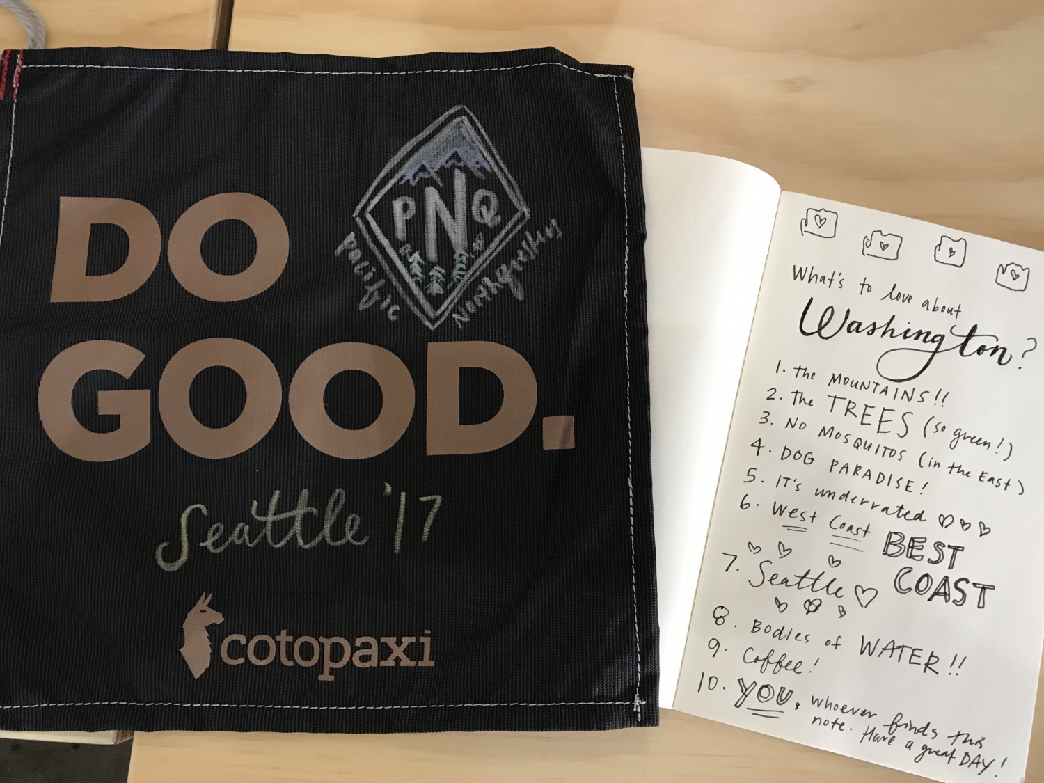 We left the house around 7:30am and headed to Mighty-O to share a donut without using our hands. It was hilarious. We also left a note of our favourite ten things about Washington.