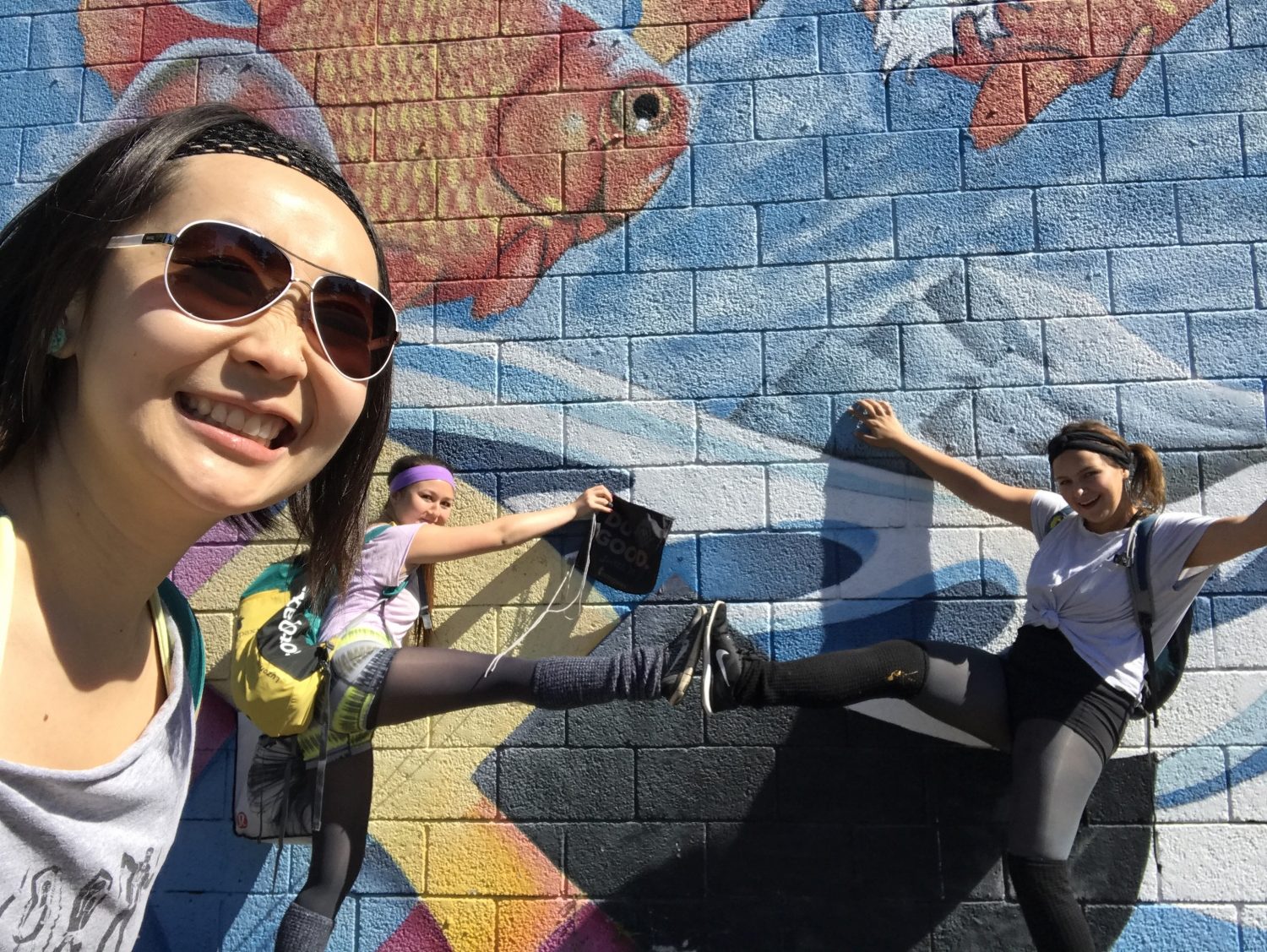 We went to Jo-ann to make bandannas and then went to a Zumba class in Central district dressed in 80s aerobic gear. We took photos in front of street art and crossed an intersection as if we were on the moon.