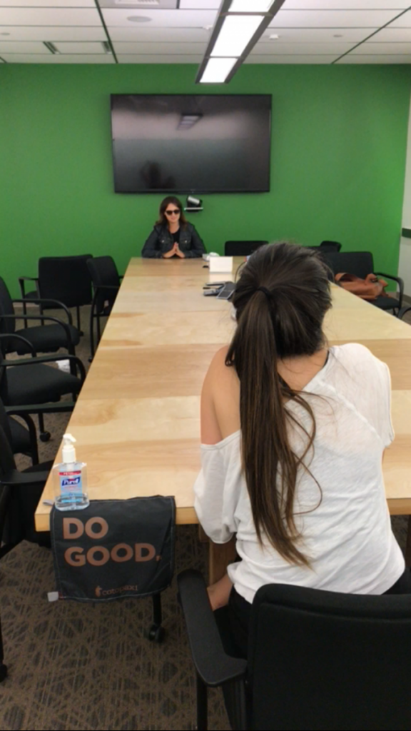 At 7:30, we were off and headed back to Amazon to reenact a performance review in a boardroom, give a hug to a “stranger” and demonstrate a skateboard trick.