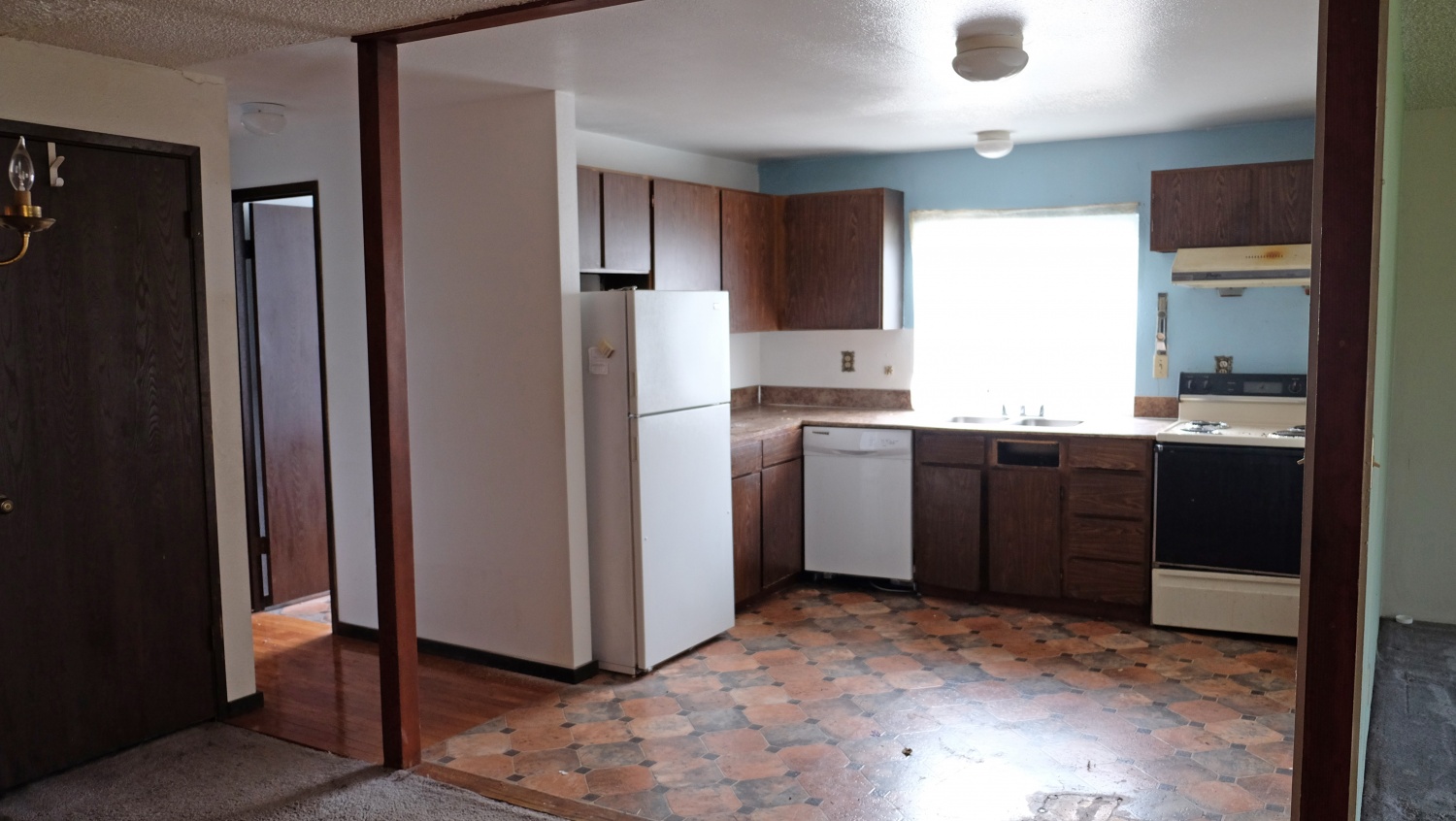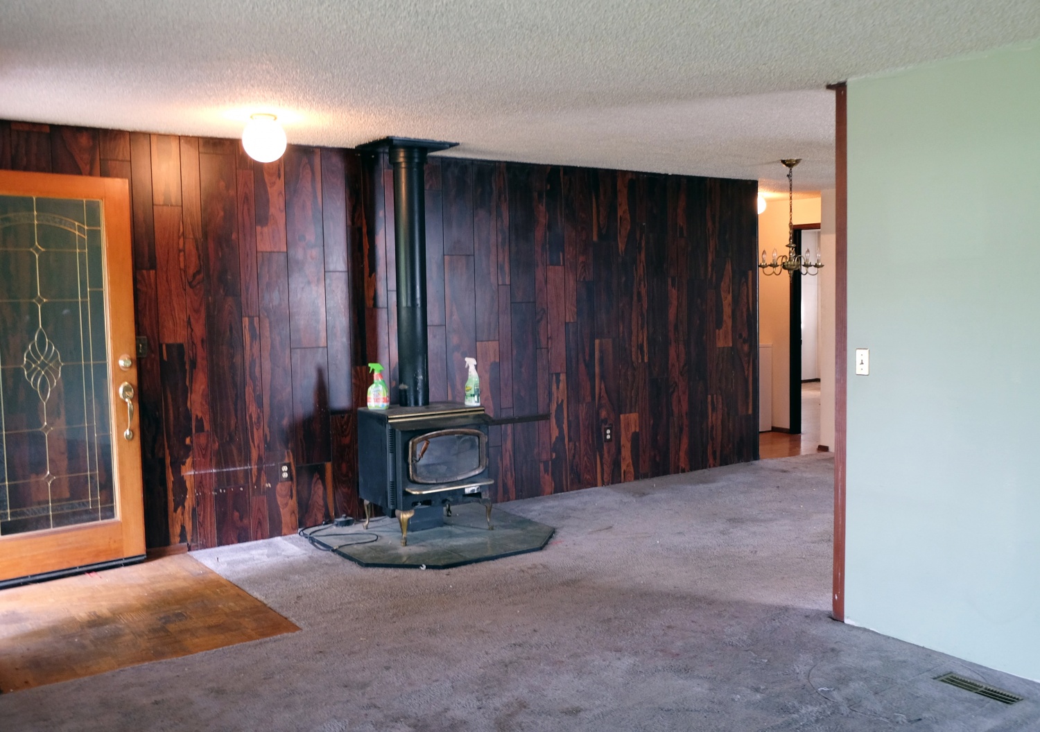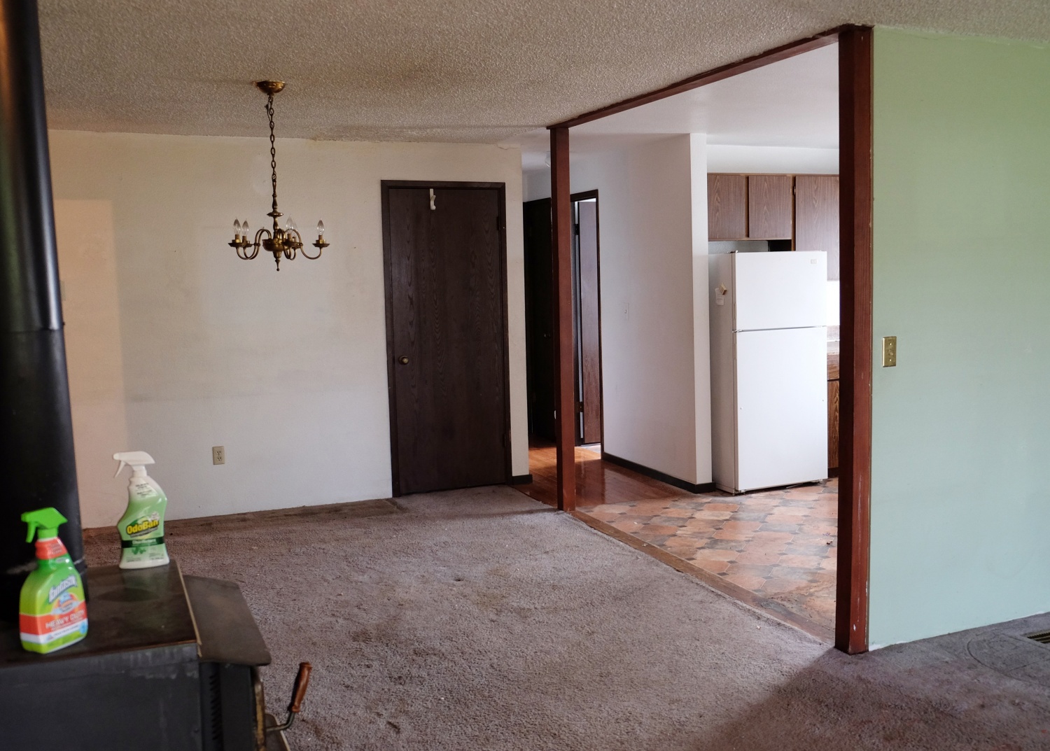 Garage with carpetOur living room, dining room and kitchen are close together and knocking down one wall will easily open the space. The living room featured a dusty wood burning fireplace.