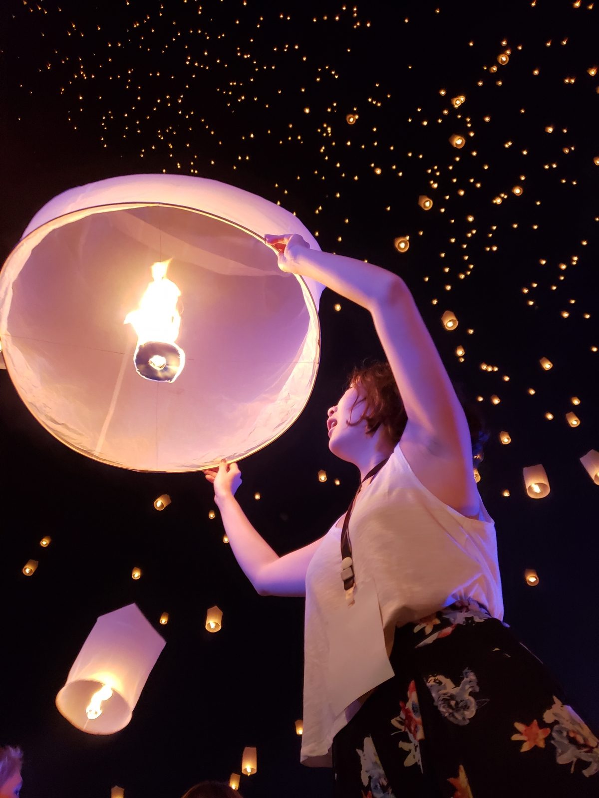 After food and activities, we proceeded to our lantern release designated ‘seats’. There was a short opening ceremony and then we were handed two lanterns each. People were eager and lit off their lanterns… The MC had to continually yell at people in all languages to stop lighting them so we can have a mass release. The live music starts and the lanterns began releasing in the sky.
