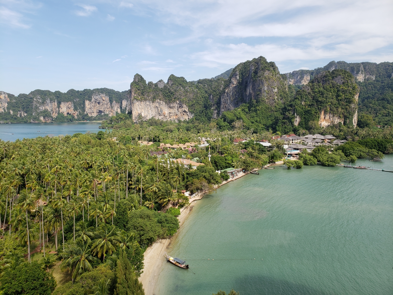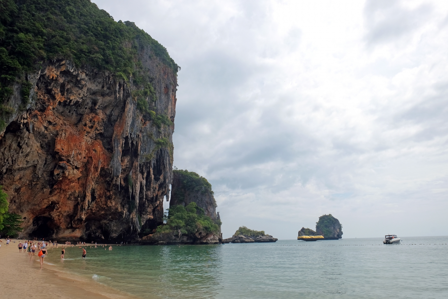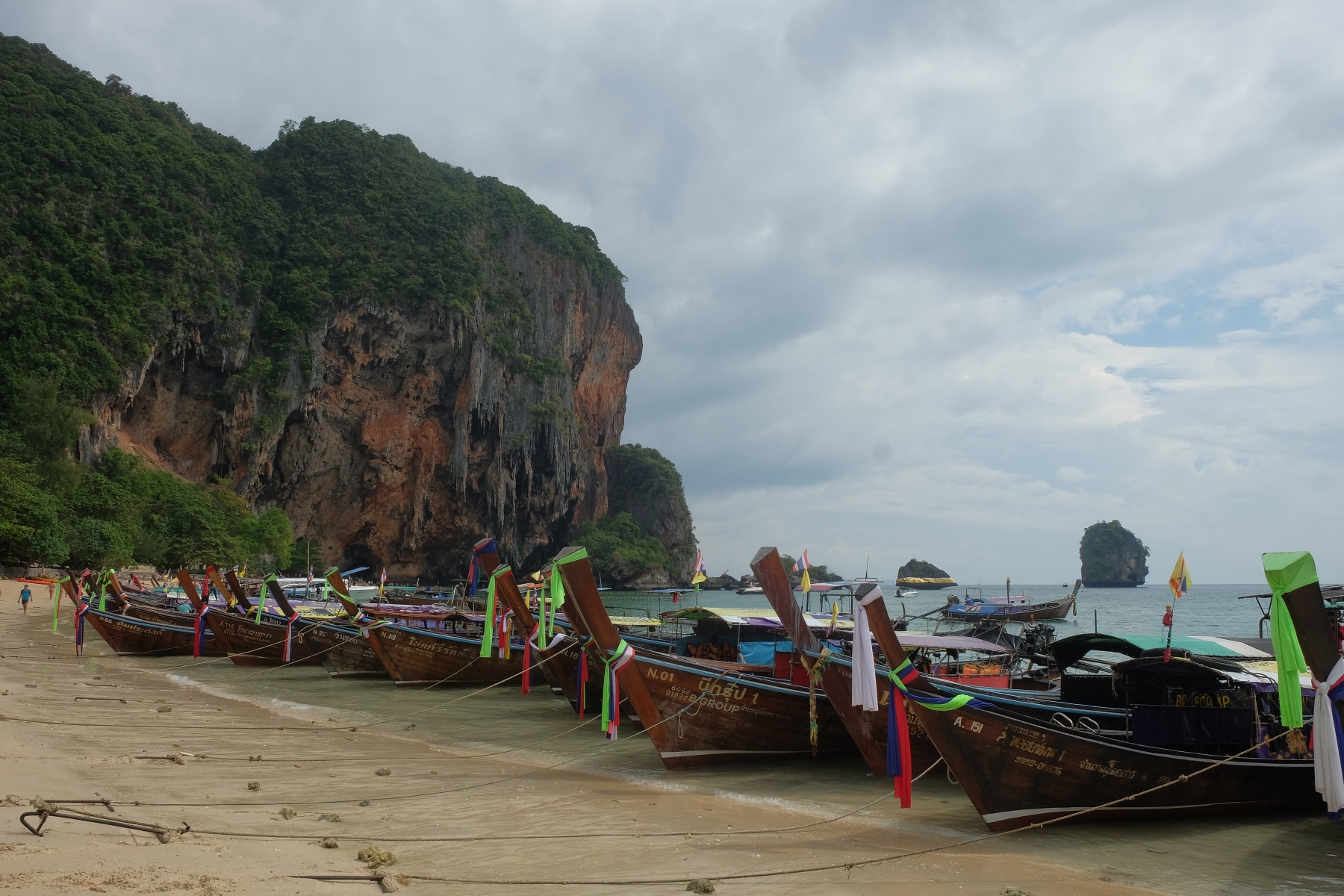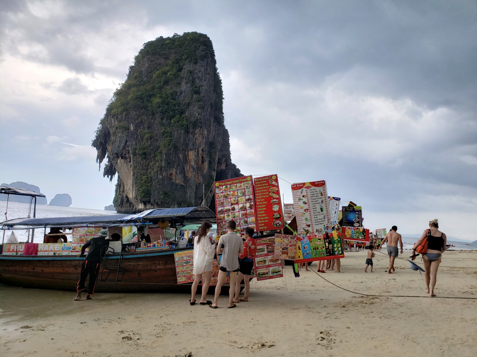 Our first stop was Railay beach. We arrived with our beachfront resort but no early check-in so instead we hit the beach. We walked to Phra Nang Beach which is about 15 minutes away. It was a beautiful but busy beach. It started to rain but we wandered about and enjoyed a late lunch at these food long tail boats.
