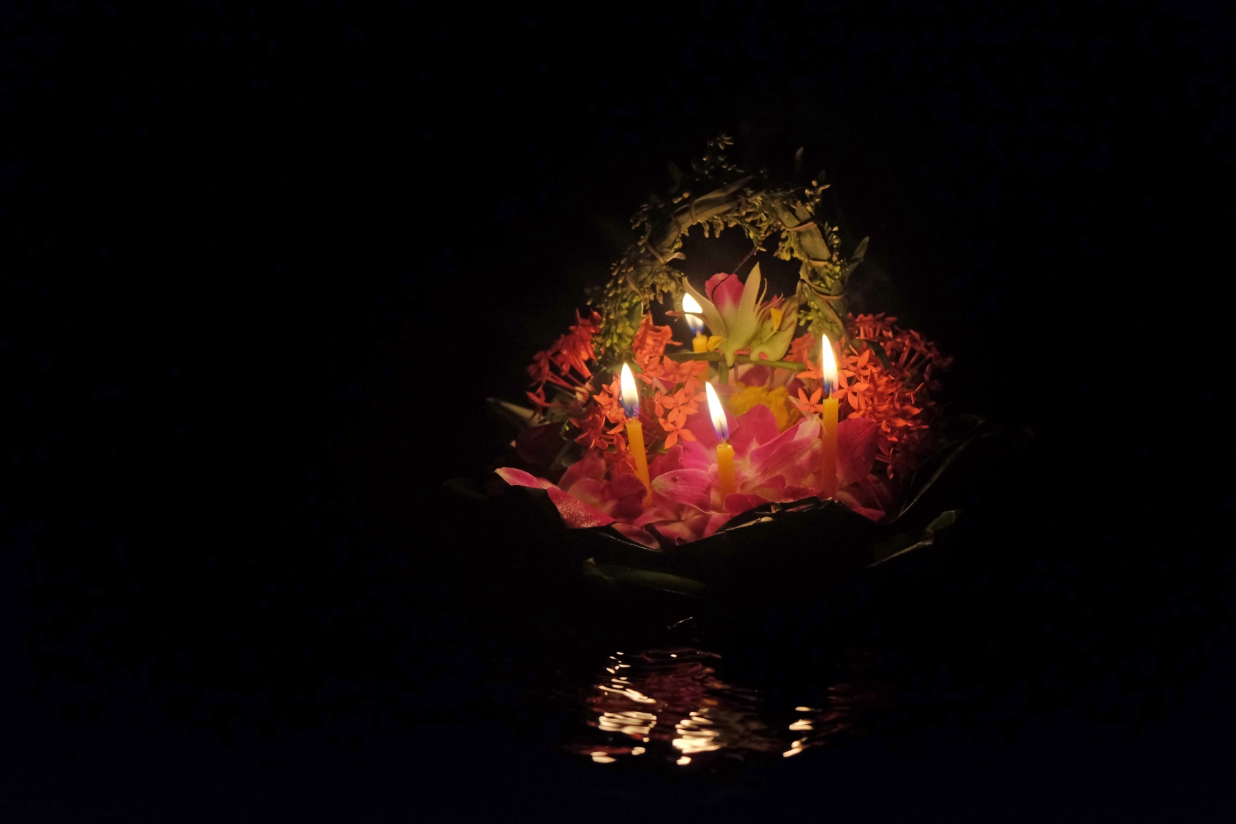 We had a coffee break on the boat and made Krathongs. Soon after, we lit them in a
