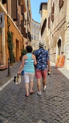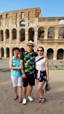 We checked into our hotel to take a break from the heat and relax until it was cooler in the afternoon. It didn’t get much cooler when we ventured out again… We had a quick bite near the Trevi fountain —Roman-style pizza, crispy compared to Neapolitan style. The fountain was still packed with tourists. We walked towards the Roman Forum and Colosseum. It was getting cooler as the sun was setting and glowed beautifully on this world wonder.