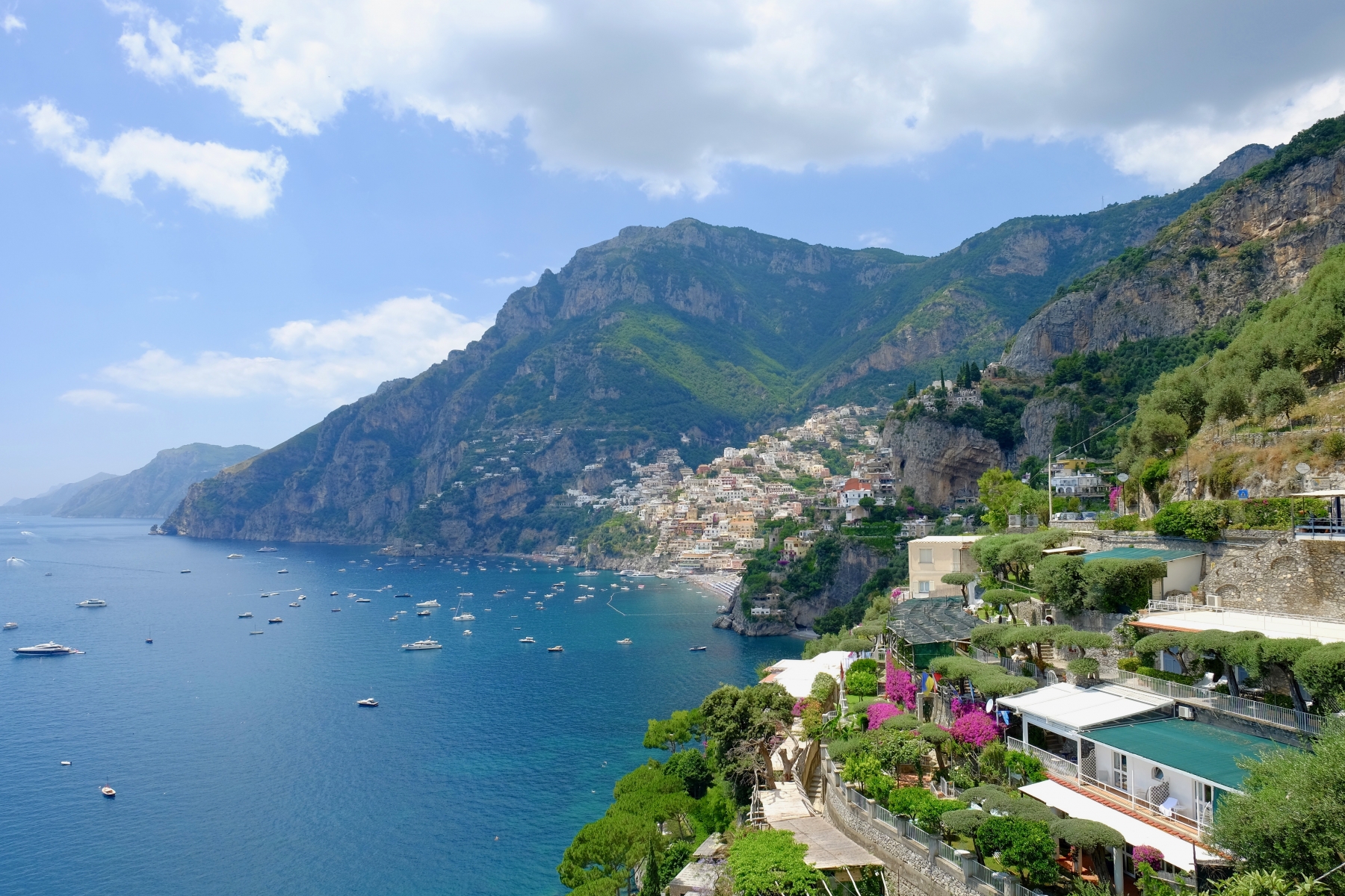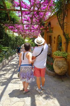 With a private driver, we took the reverse route of the usual tours. We started in Ravello, a small hilltop town. We stopped for an hour to see the stunning mountain-top view. I also went into Villa Rufolo but ran out of time to see all the gardens. Ravello was lush with greenery and purple and pink Bougainville flowers.