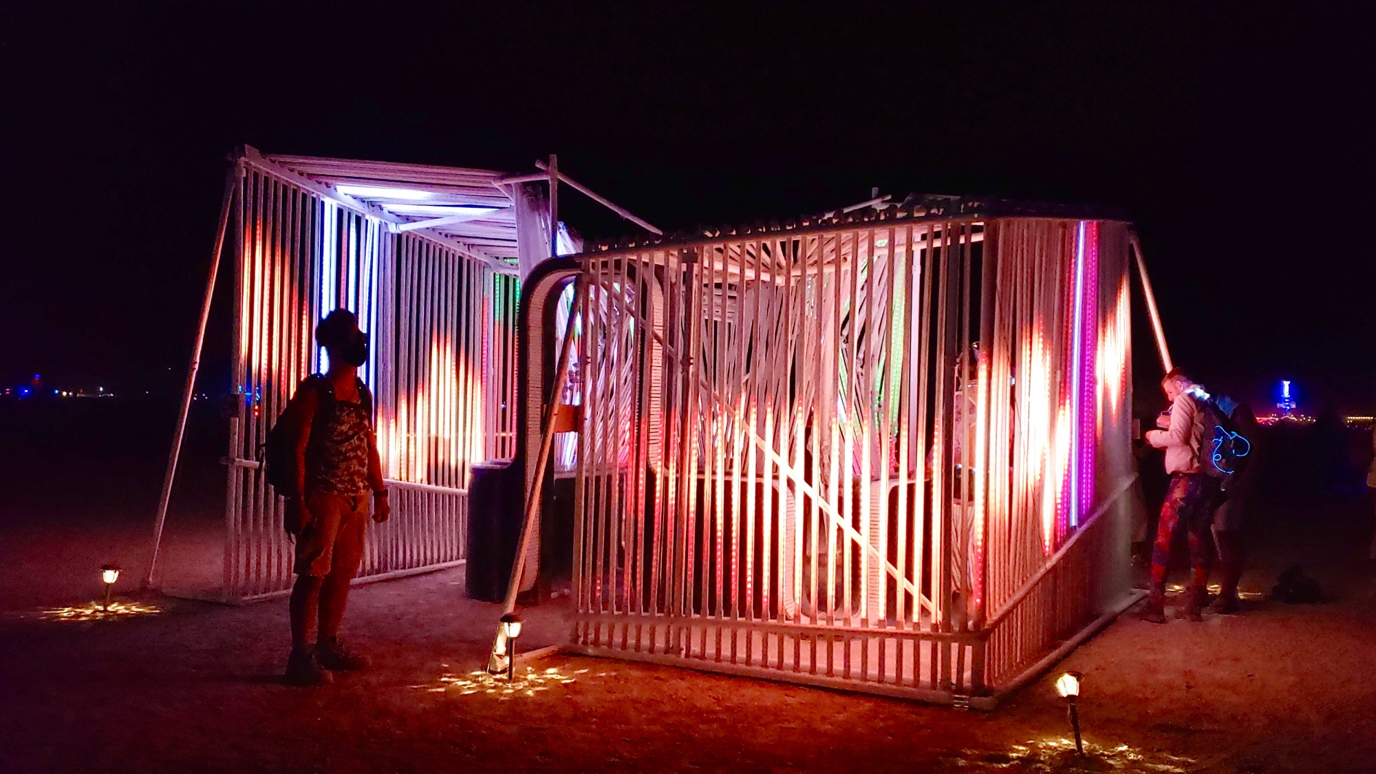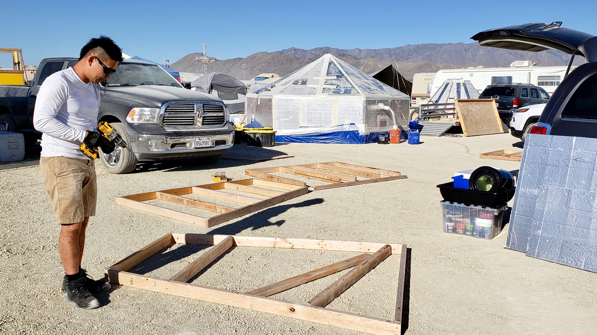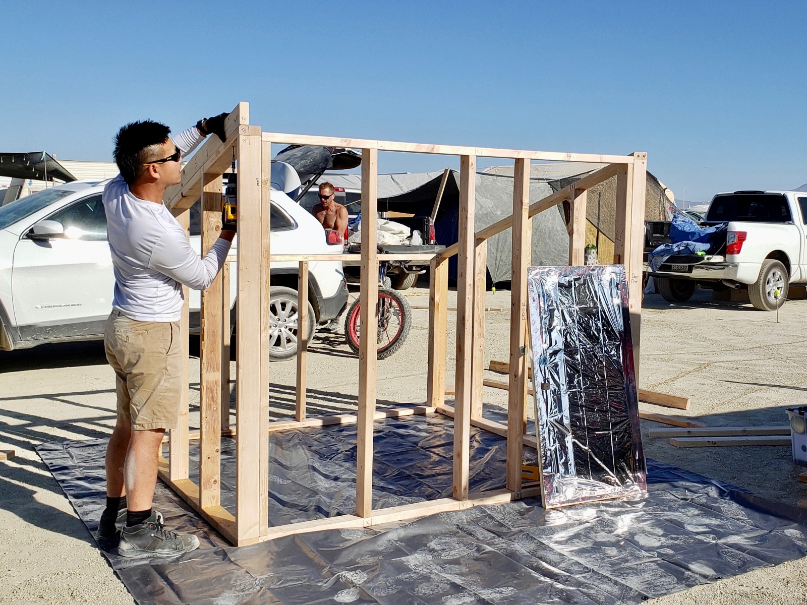 For our shelter, we decided to build a tiny house made from plywood and insulation sheets. Chi prebuilt it at home and assembled it on the desert playa. This was dust-proof but not heat-proof. We would need a better swamp cooler and airflow next time. Regardless, it was impressive for “burning man virgins”. Chi was the MVP.