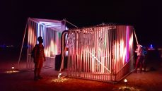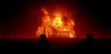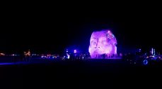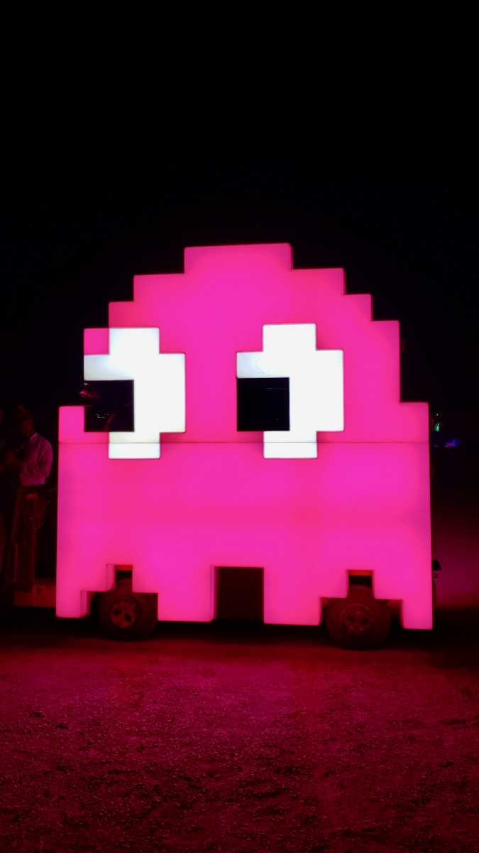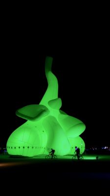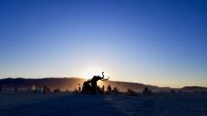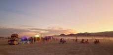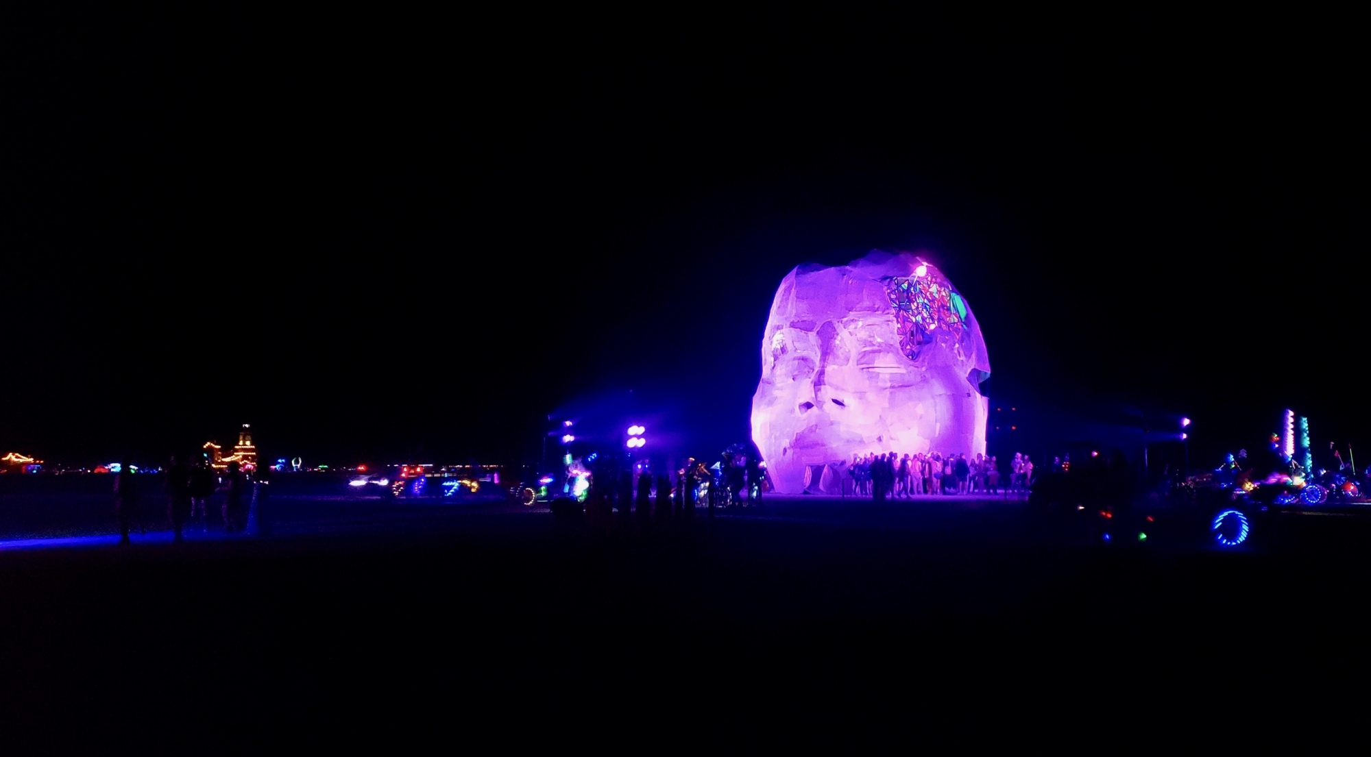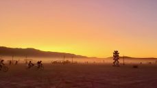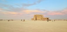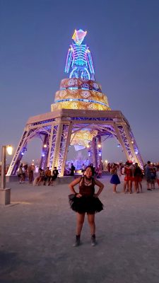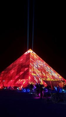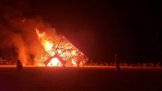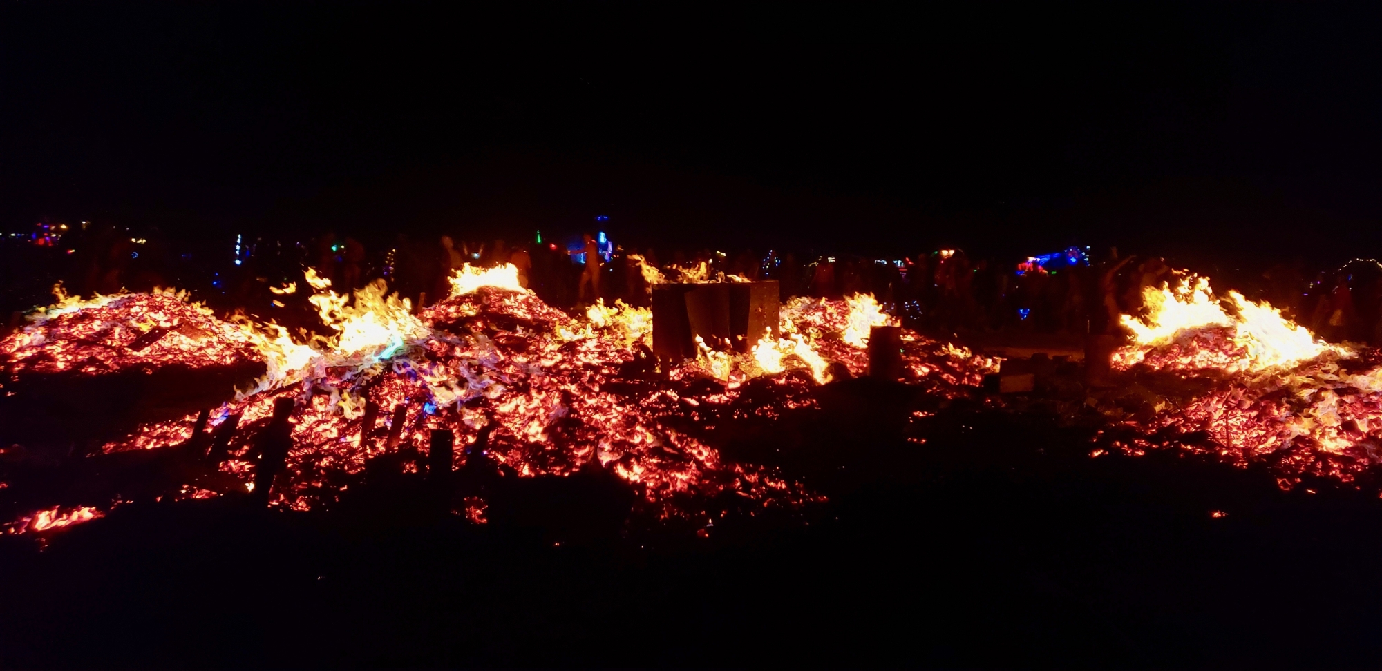 Today, I wanted to be further out on the Playa as the sunset. The sky was purple and pink. We explored more ‘deep playa’ art pieces and witness our first art burn on the ‘Temple of Brad Pitt’. A small spark started which then grew to demolish an entire temple.