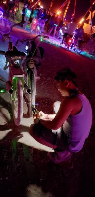 Aside from our shelter, we also invested time in making our bikes unique. I used PVC foam to steampunk my bike while Chi styled his after Madmax. It took me a solid 3 months to finish and I learned how to wire up LEDs for the night. I was pleased with the outcome but of course, after the first day, it was covered in playa dust.