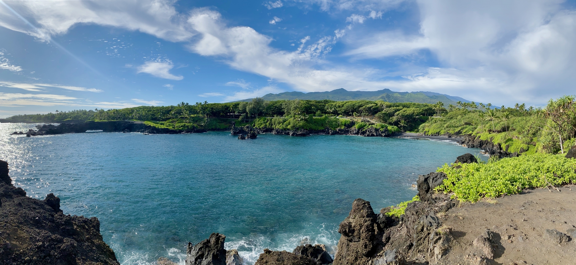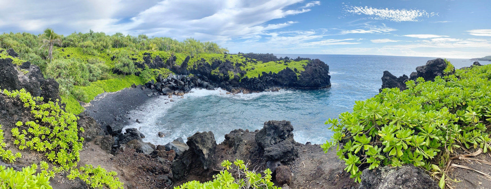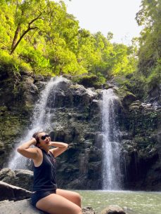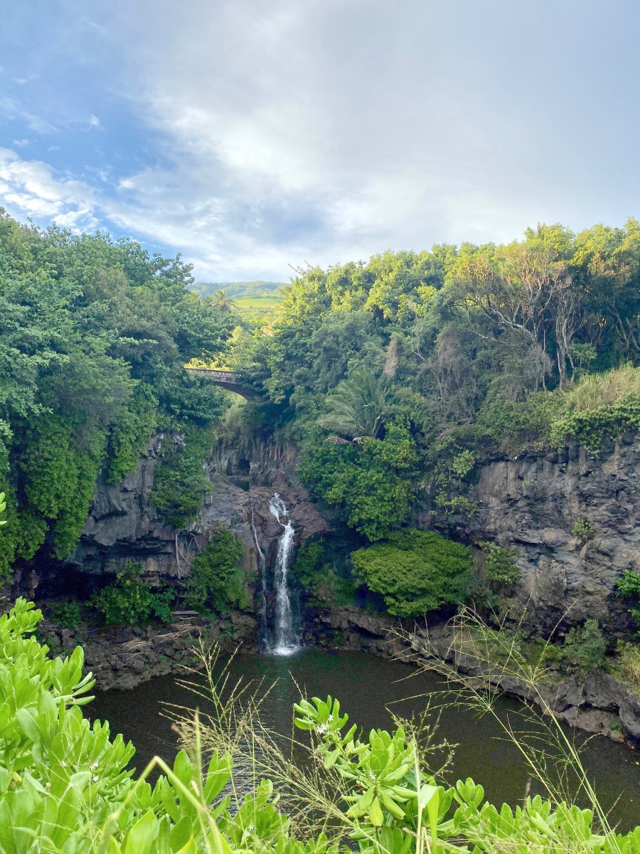 Because we camped here, we were among the first people to take photos and explore the black sand beach without many other tourists. Our morning hike along the Pailoa Bay coast was hot but I loved how the bright green lush plants contrasted the dark black volcanic rocks. On this clear blue sky day, we even got to see the summit of Haleakala. We finished our hike with a refreshing dip in the water. This park was beautiful and one of my favorite sights on the road to Hana.