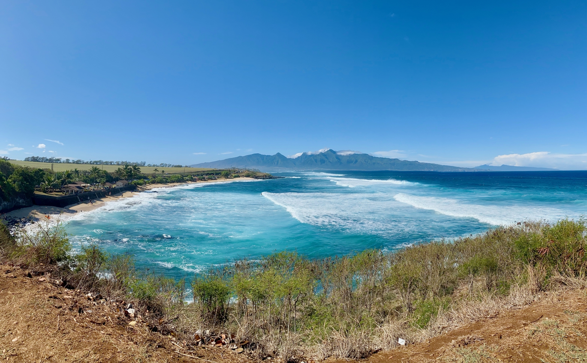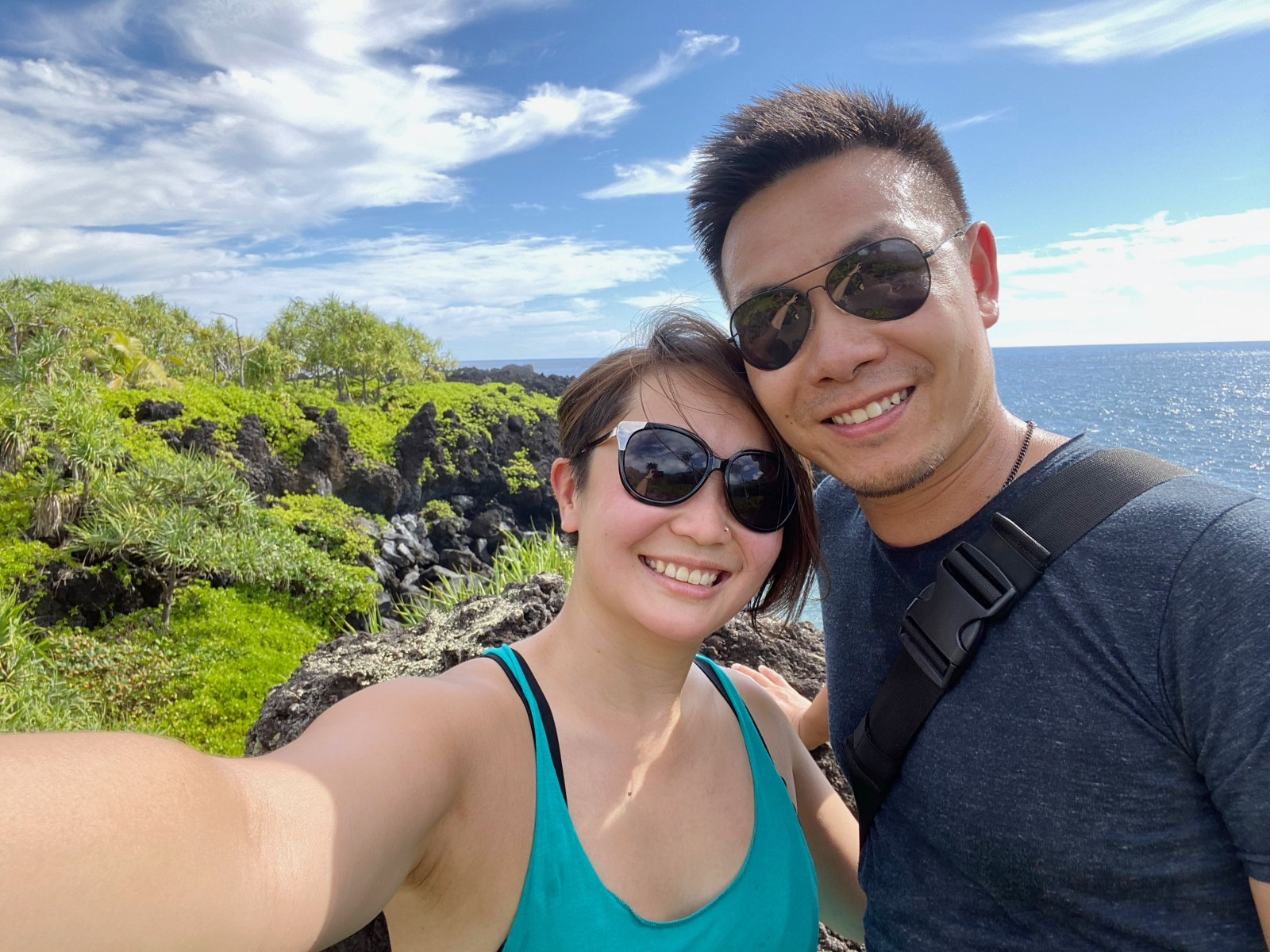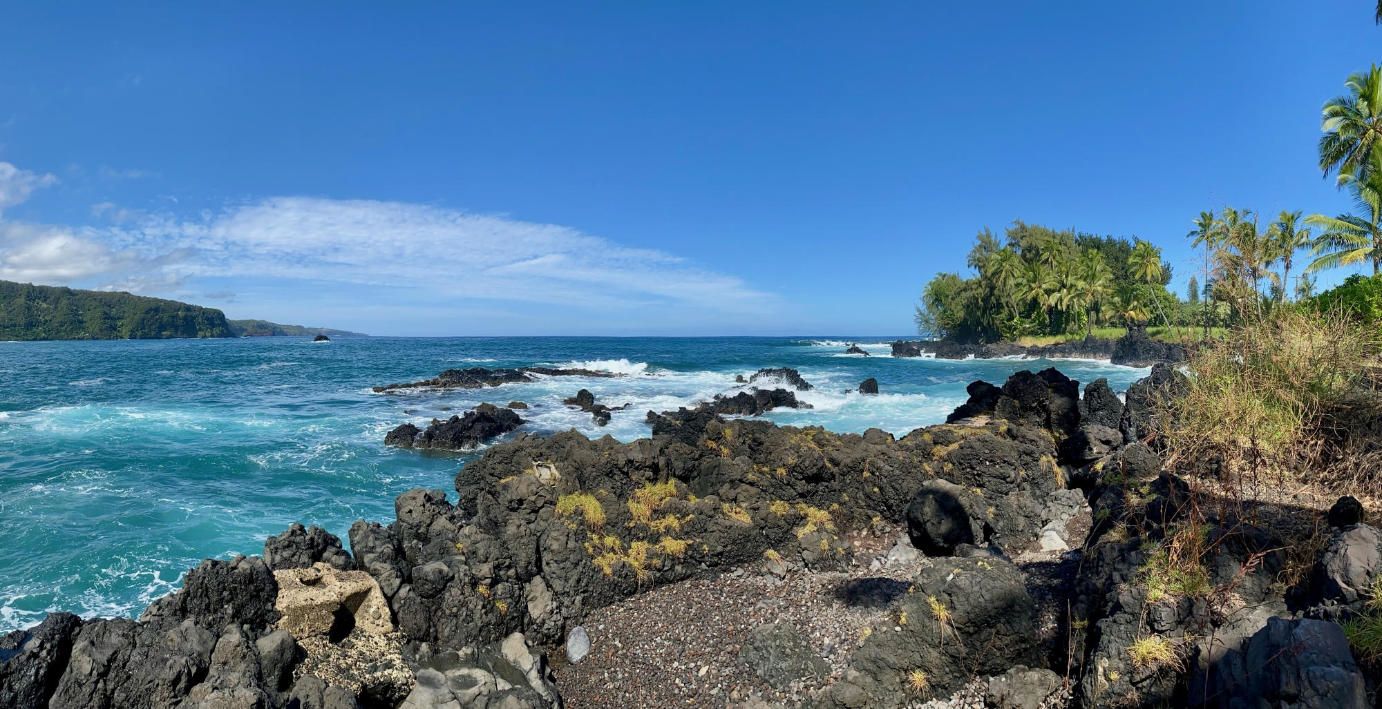 Because we camped here, we were among the first people to take photos and explore the black sand beach without many other tourists. Our morning hike along the Pailoa Bay coast was hot but I loved how the bright green lush plants contrasted the dark black volcanic rocks. On this clear blue sky day, we even got to see the summit of Haleakala. We finished our hike with a refreshing dip in the water. This park was beautiful and one of my favorite sights on the road to Hana.