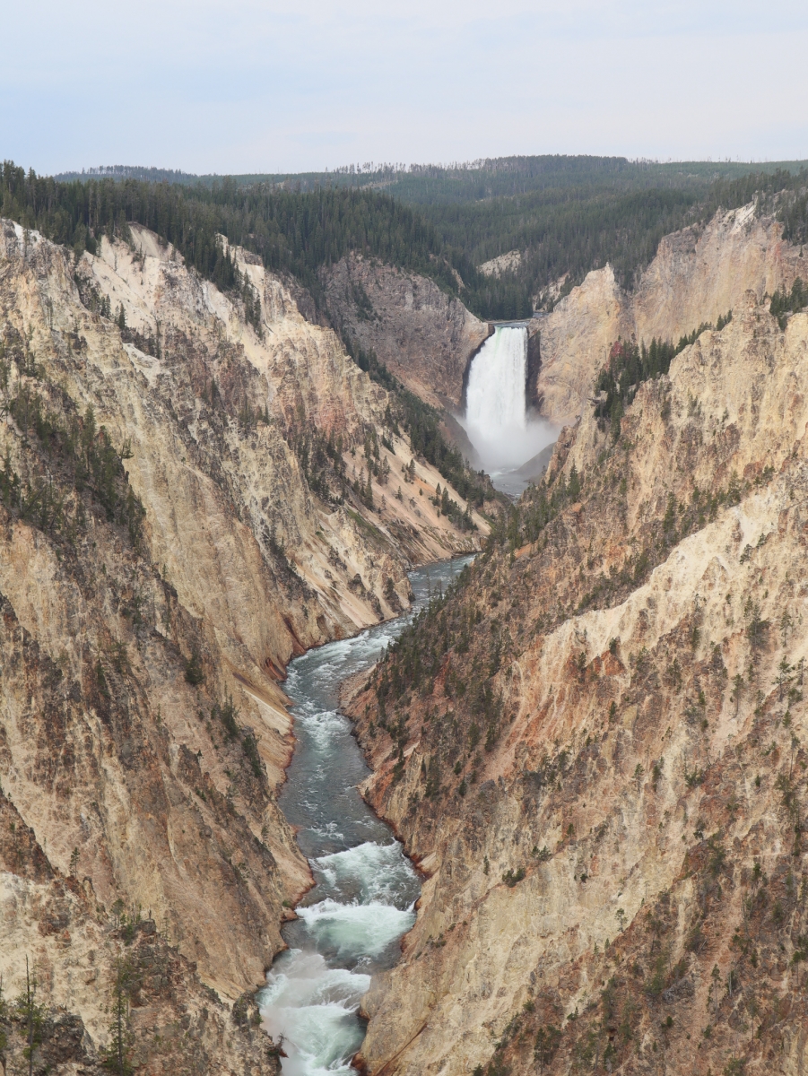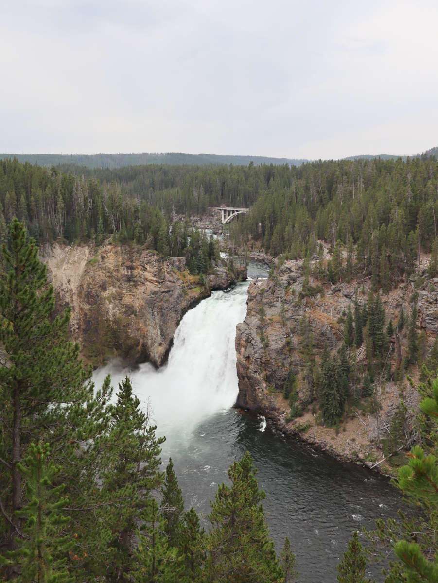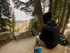 We headed back to our car as the crowds arrived. The next Old Faithful eruption already had a large audience in the viewing platforms. We drove to Fairy Falls to hike to the Grand Prismatic Overlook. This was a busy spot and people were not wearing masks. When we first arrived at the overlook, it was cloudy and the spring was still a bit steamy… not the best view. So we continued 1.6 miles to Fairy Falls. They were nice but to be honest, underwhelming. I’ve seen better and it wasn’t worth the relatively boring hike.