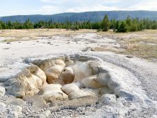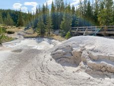 Chi was eager to head to our campground but I was eager to make one more stop at the Artist Paint Pots. He reluctantly agreed and it was a short hike to see another collection of small geysers and one of my favorite sights of the trip. It was a thick goopy white mud pot. It looked like melted ice cream bubbling with a flakey section like spitting out wet cement.