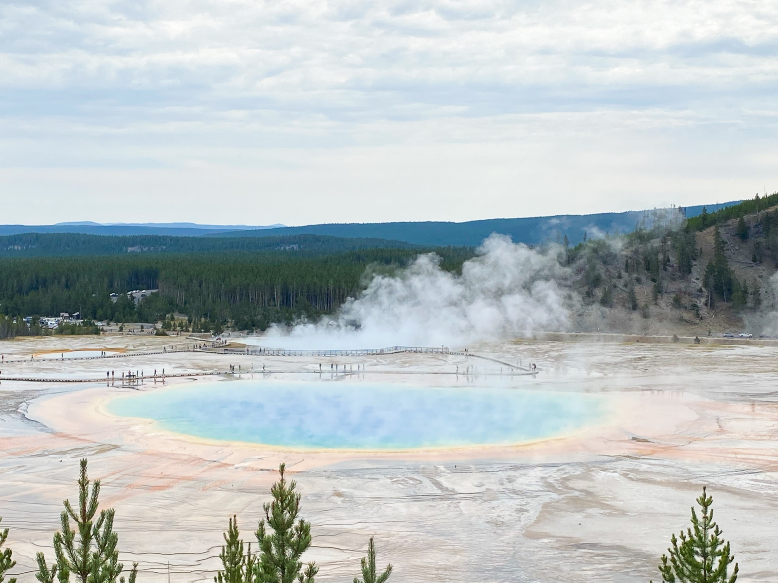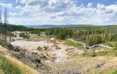 We continued walking along the one-way boardwalk to view the Grand Prismatic Spring. You couldn’t see much of it from ground level but you could see the patterns and rings of colors. Seeing it from above at the outlook and up close from ground level is both impressive… but also shared with many other fans.