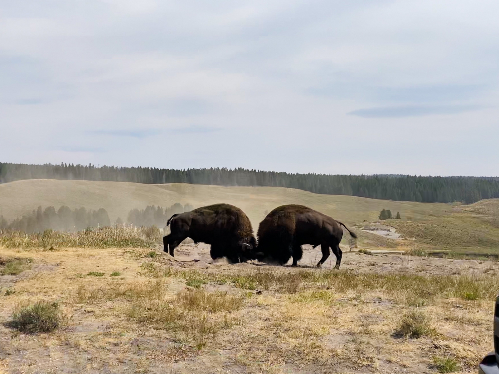 We had instant noodles, eggs, and spam for breakfast at the nearby picnic area. Most of our planned meals were self-prepared to minimize contact with others. We drove about an hour to Lamar Valley, a famous spot to view wildlife. Along the way, we encountered our first herd of bison.