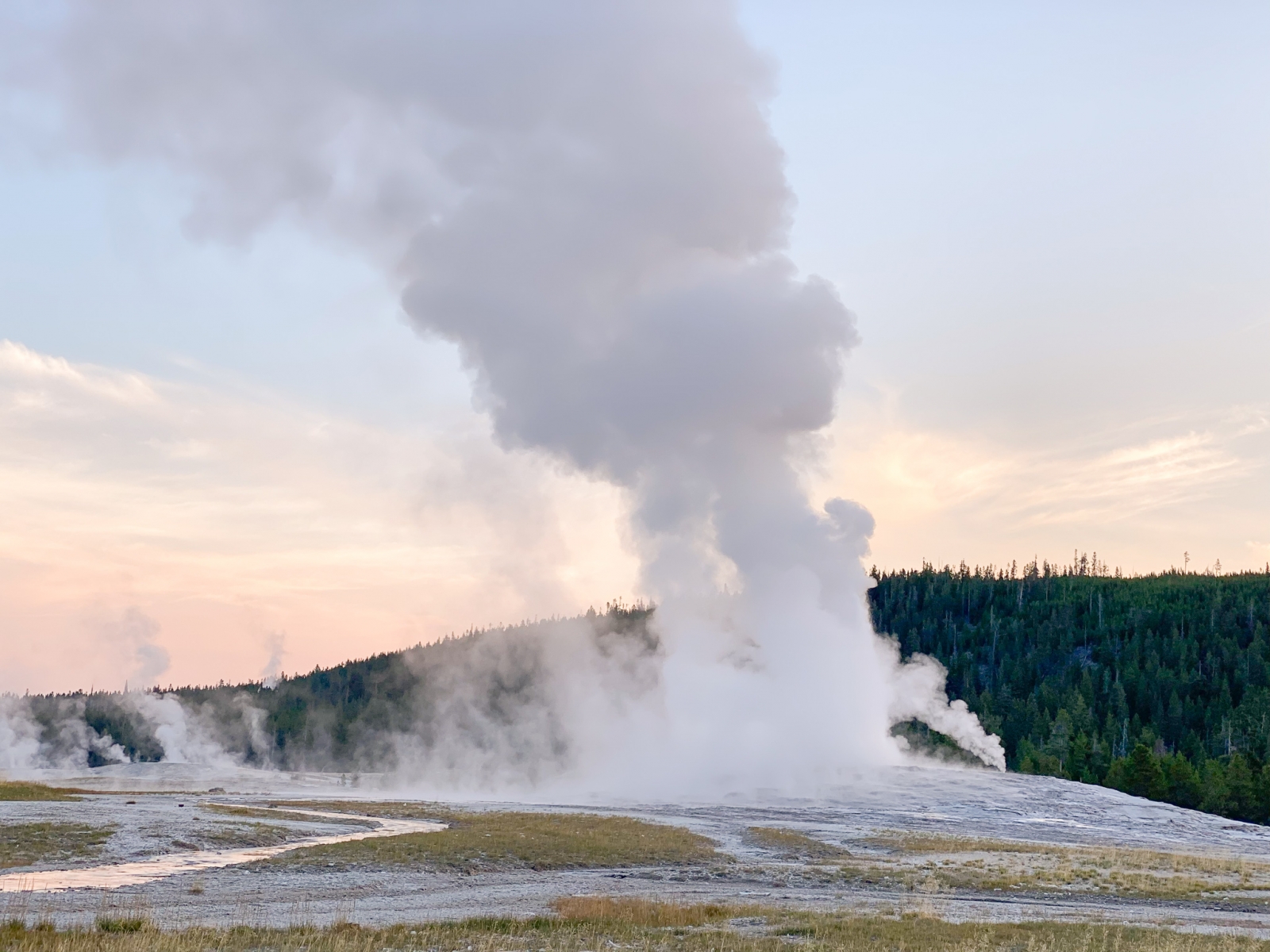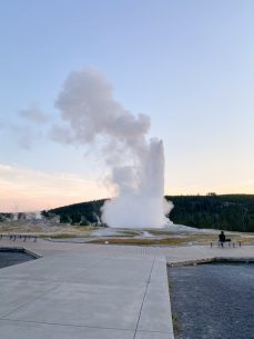 I woke up in the cold at 5 am (4 am, Seattle time) and managed to get enough cell service to learn that the next Old Faithful geyser eruption will occur between 6:35 am to 7:00 am. As I knew this was the most famous geyser, I eagerly woke up Chi to get ready to catch the first eruption of the day. We packed our breakfast gear (our backpacking stove, pot, and oatmeal) and made it just in time for the eruption. The viewing area was empty! We enjoyed the show and then started to hike around the upper basin area.