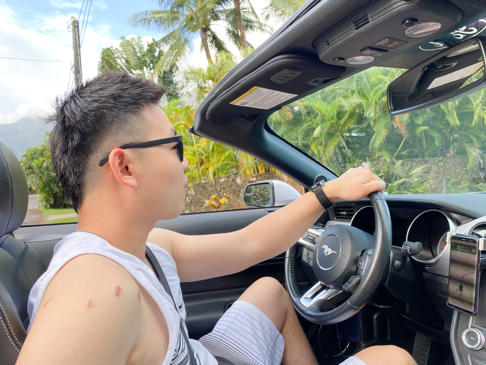 The flight was pretty similar to pre-covid except for masks and individual drinks, so small bottles of water and mini pop cans. After our 6-hour flight, we made it to Kauai! I was nervous about the car rental since I read about shortages due to the covid shutdown in 2020. But it was a smooth process and we even got a free upgrade to a Mustang convertible!