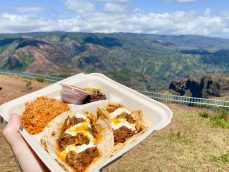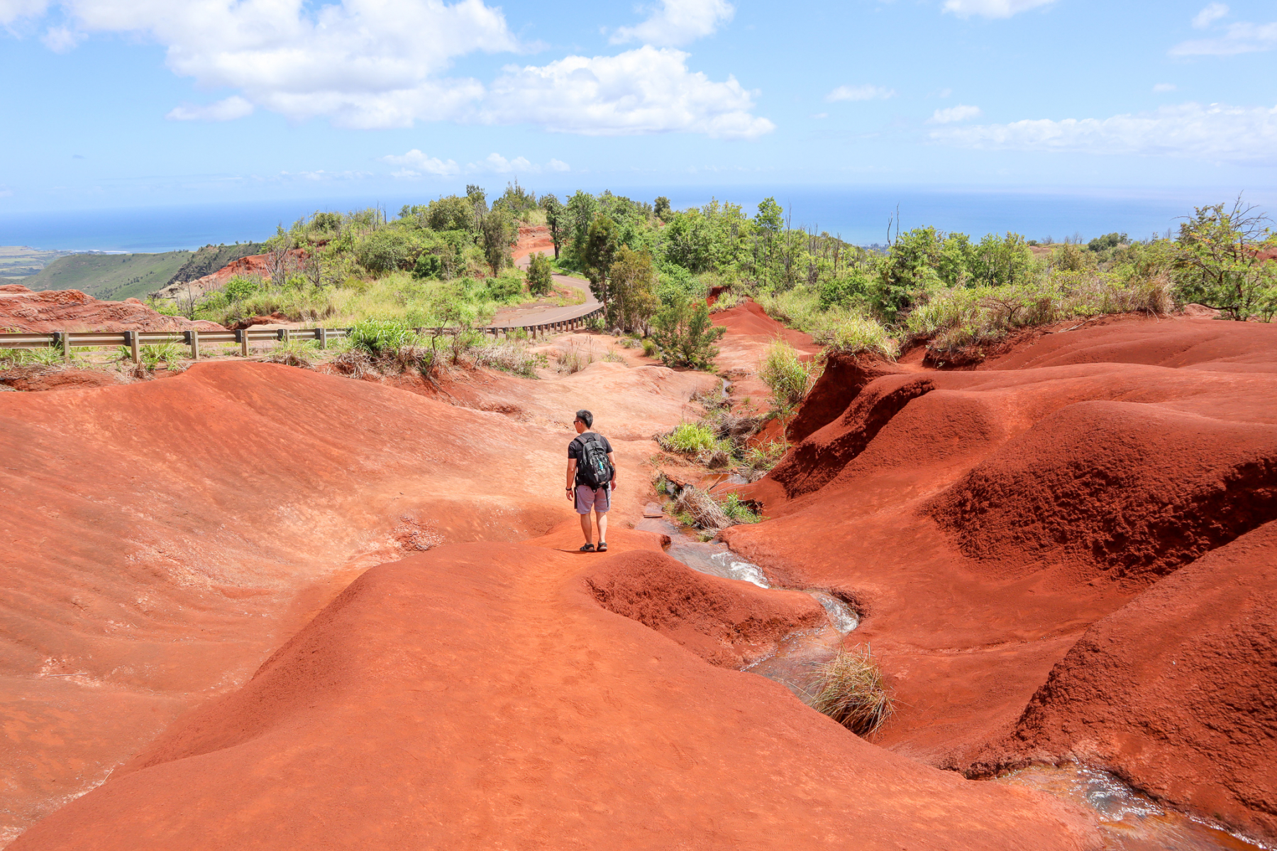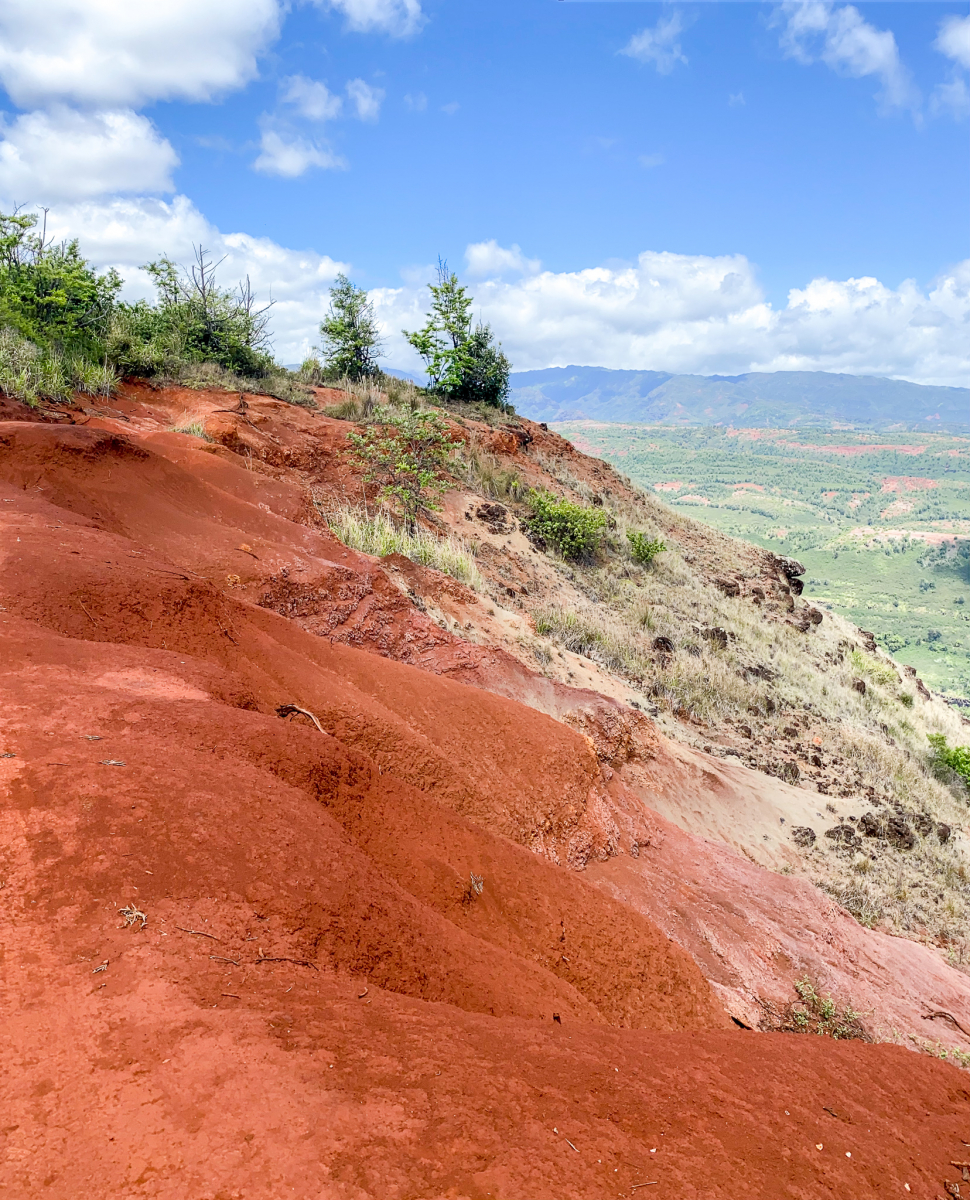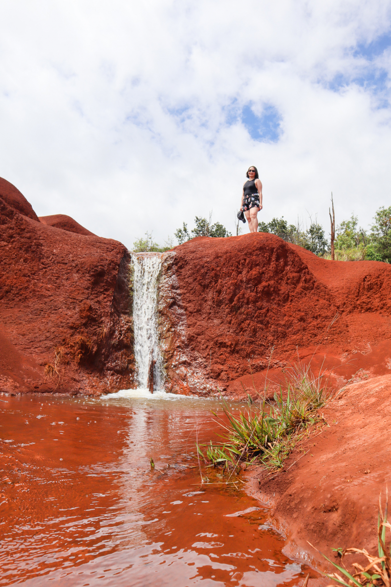 For lunch, we grabbed shaved ice from Waikomo and packed a taco lunch from Da Crack to bring to the Waimea Canyon Lookout. But first, we stopped to explore a red dirt waterfall.