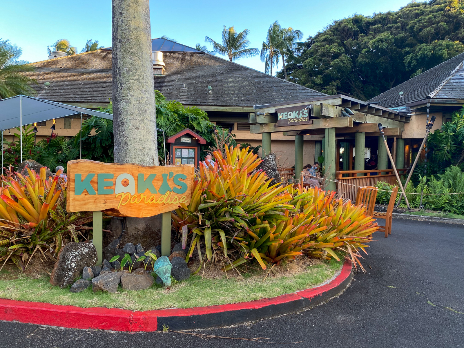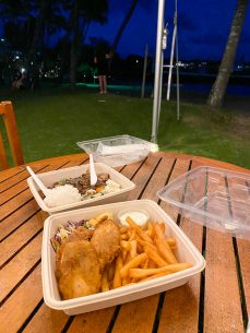We didn’t have anything else planned, so headed back to the hotel to take a nap and lounge by the pool. We freshen up with their hospitality lounge and then headed towards the airport for dinner. We should have arrived earlier but ran out of time to get a dining room table at Duke’s. Instead, we ate takeout next to Kalapaki beach, underneath string lights.