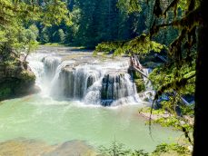 It was a record-breaking heat day. We checked out of the cabin and started our drive back to Seattle. But first, I planned to cool off at a popular waterfall, Lewis River Falls. Many people swim in the river and we ended up at lower falls. The water was icy cold to bare but it was cooling to splash around and sit next to it.