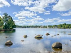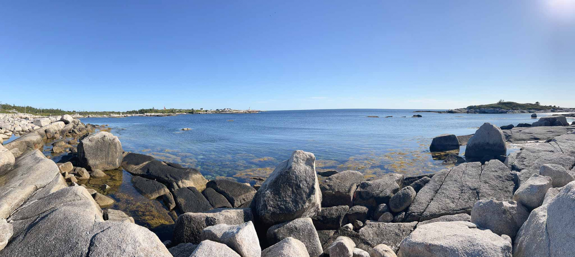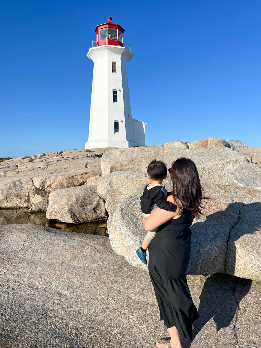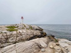 Max napped in the car and we had an open afternoon. Given the perfect weather, we decided to visit Peggy’s Cove again for sunny conditions. We first stopped at Cranberry Cove lookout and had a quick little off-trail hike on rocks to view the lighthouse from afar.